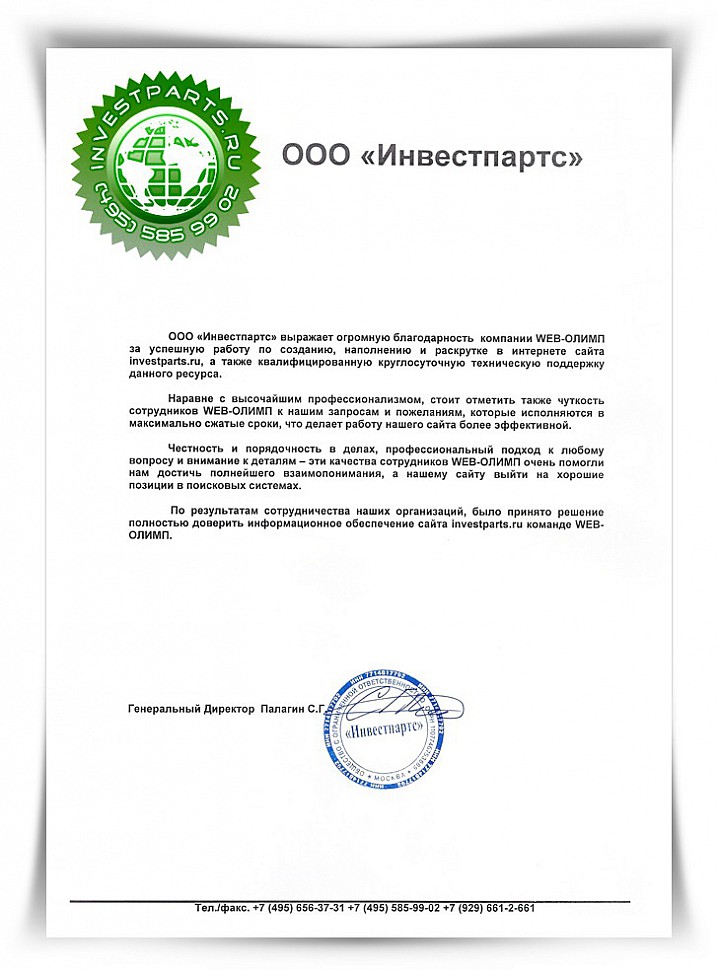 ООО «Инвестпартс» выражает огромную благодарность компании WEB-ОЛИМП за успешную работу по созданию и раскрутке в интернете сайта investparts.ru, а также квалифицированную техническую поддержку данного ресурса.
