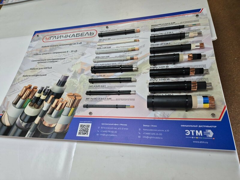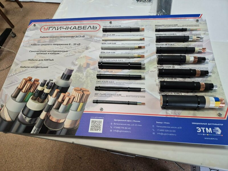 Основание стенда выполнено из жёсткого ПВХ толщиной 5 мм с прямой УФ-печатью по поверхности. Образцы кабелей аккуратно зафиксированы чёрными нейлоновыми стяжками — надёжно, аккуратно и с возможностью быстрой замены экспонатов. Крепление самого стенда — на дистанционные держатели, создающие «парящий» эффект и защищающие плоскость от контакта со стеной.