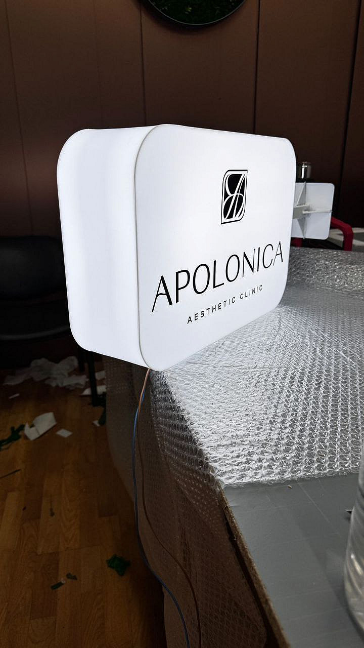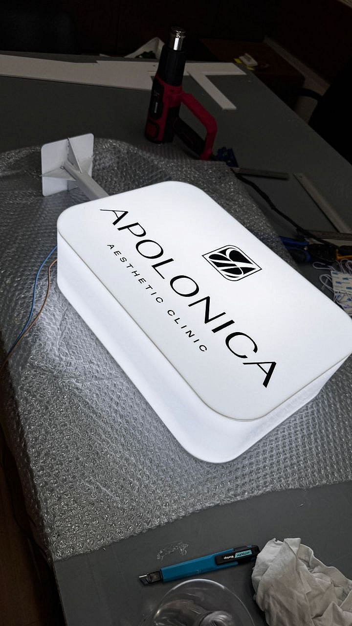 Лайтбокс размером 450х300 мм из молочного акрила с двухсторонней аппликацией черной пленкой Oracal 641.