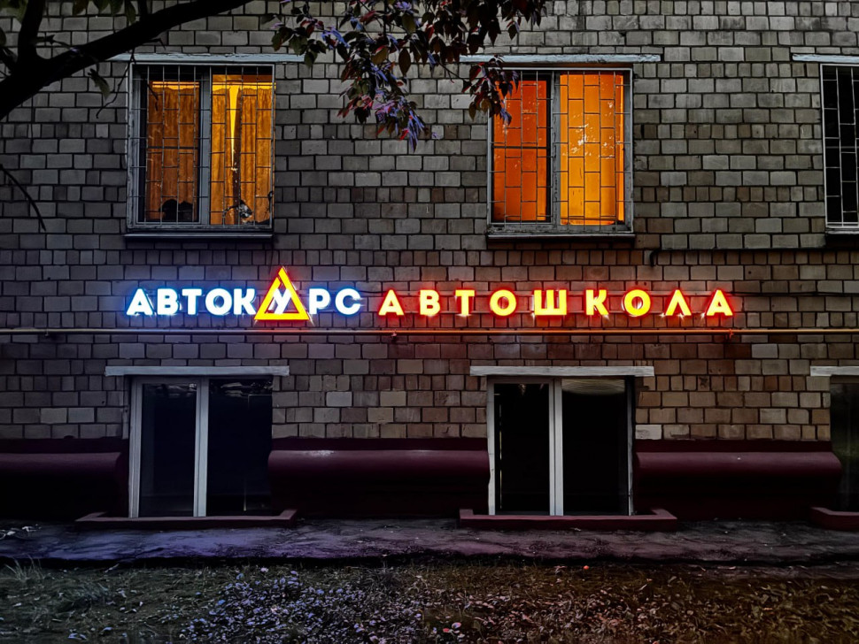 Изготовление и монтаж объёмных световых букв на подрамнике для Автошколы Автокурс. Лицевая часть выполнена из акрила, торцы из алюминиевого профиля, задняя стенка - ПВХ. Подсветка - светодиодные модули.